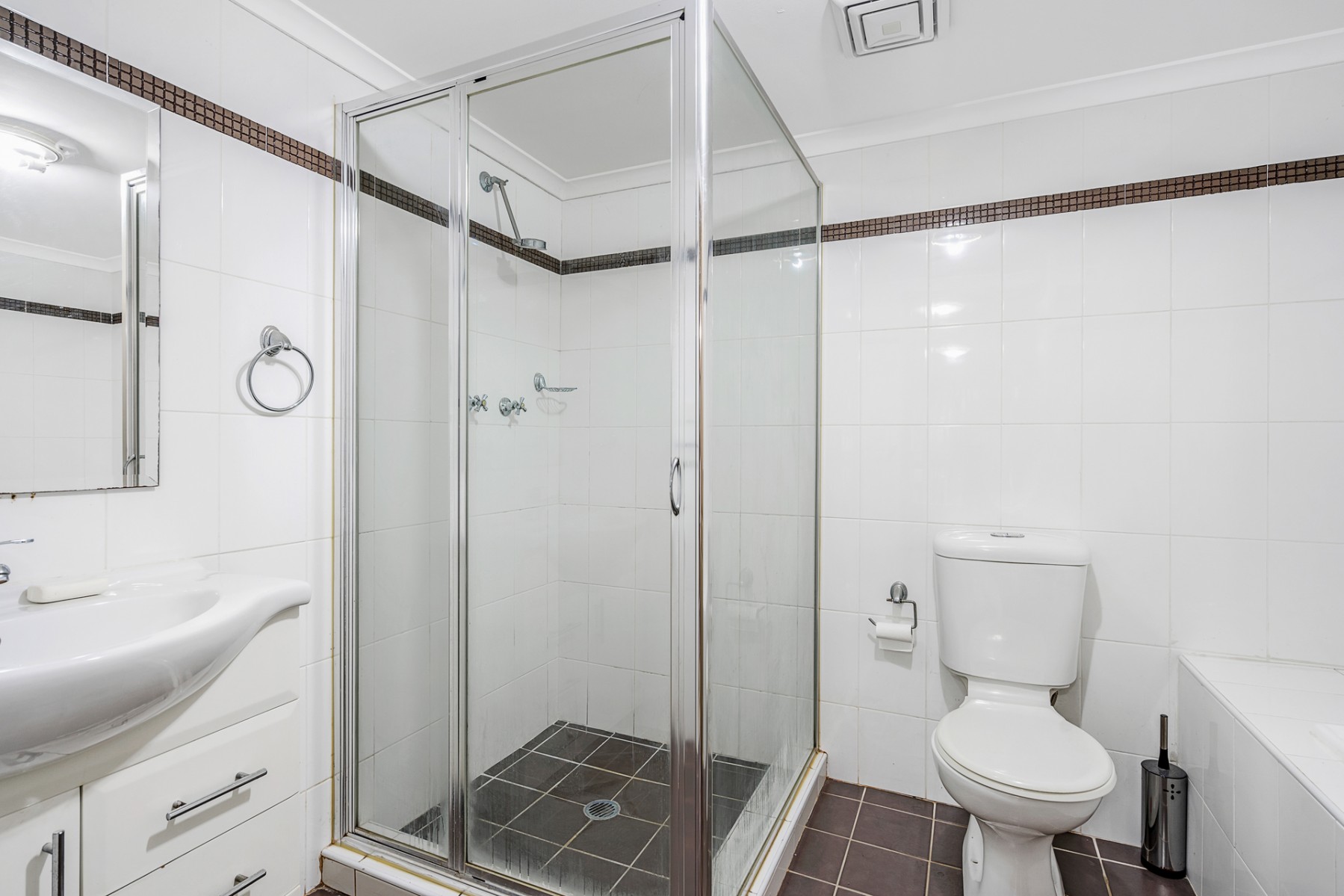 -Two floor-to-ceiling tiled bathrooms, with bathtub in one