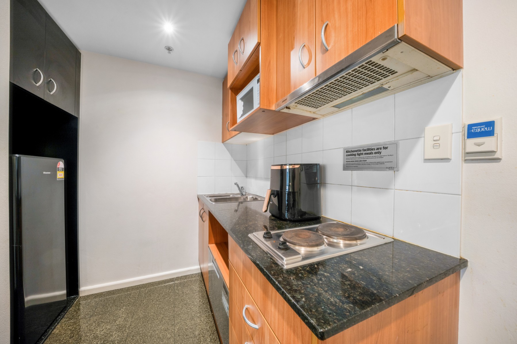 - Modern kitchen with 2 plates cook top with rangehood, microwave, and mini fridge.