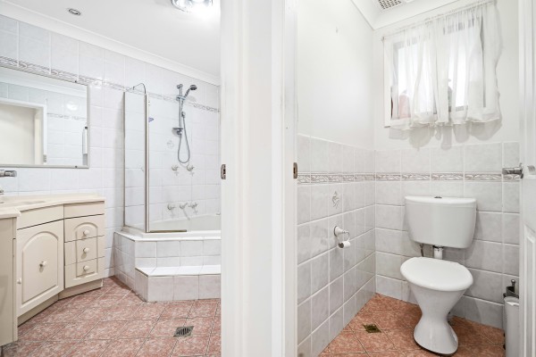 - Large bathroom tiled to the ceiling, featuring a combined corner bath and shower plus a separate toilet for added convenience